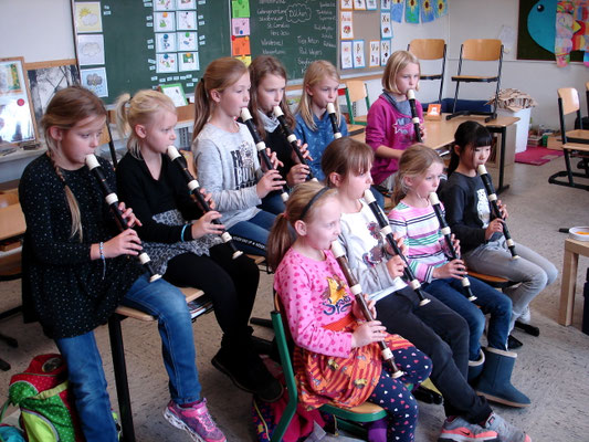 Frau Nelsen bringt den Kindern die Flötentöne bei.